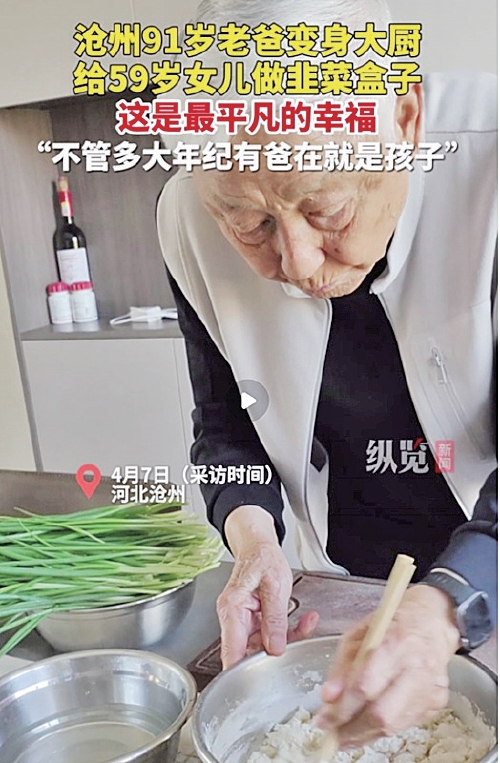 近日,河北沧州一段九旬老人为女儿制作馅饼的短视频在网络上传播,温暖了众多网友。视频中,91岁的老人刘祖光全程独立完成馅饼制作,动作熟练流畅,丝毫看不出其已有91岁,而这位被疼爱的女儿刘金兰,已有59岁。